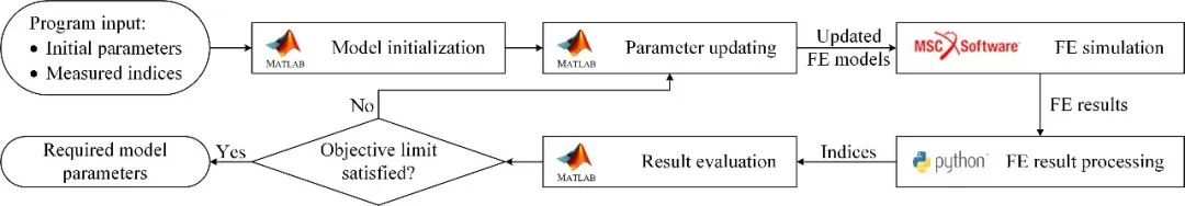 为了更新大型结构的精细有限元模型,本文基于MATLAB、MSC.Marc和Python编写了相关的模型更新程序,程序计算流程如图4所示。