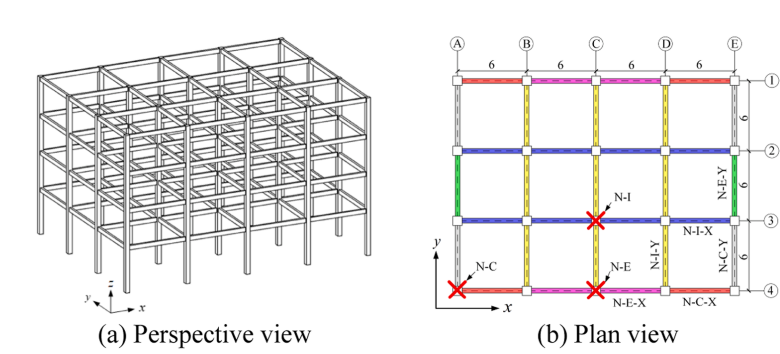 依据中柱、边柱和角柱三种柱失效工况和梁的平面位置将同一楼层的框架梁划分为六种,如图4b所示,并将其对应的纵筋设置成不同的设计变量,开展抗连续倒塌设计(详见:新论文:基于高性能计算的RC框架结构连续倒塌设计优化)。