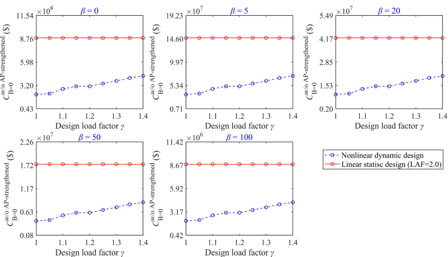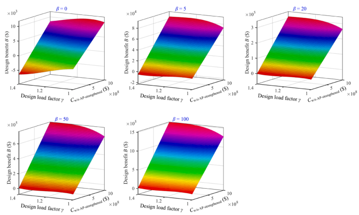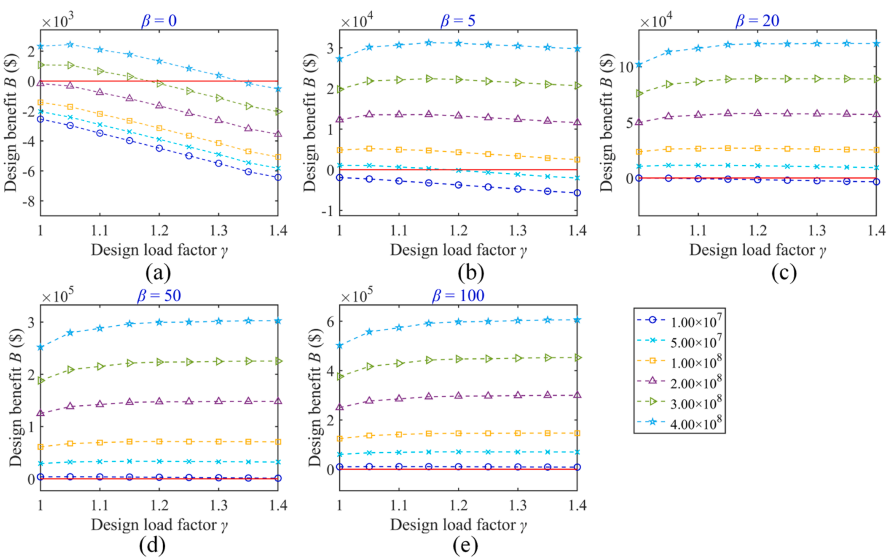 以β=5为例(图7b),当建筑价值为$1×10^7时,开展抗连续倒塌设计是不划算的(设计收益始终小于0);当建筑价值为$4×10^8时,开展抗连续倒塌设计可以获得比较大的收益,但当γ超过一定值之后,结构的设计收益增长趋于平缓。因此,开展抗连续倒塌设计时,并不是考虑越大的荷载安全系数γ获得的设计收益越大,存在一个最优荷载安全系数γ使结构连续倒塌设计收益最高。