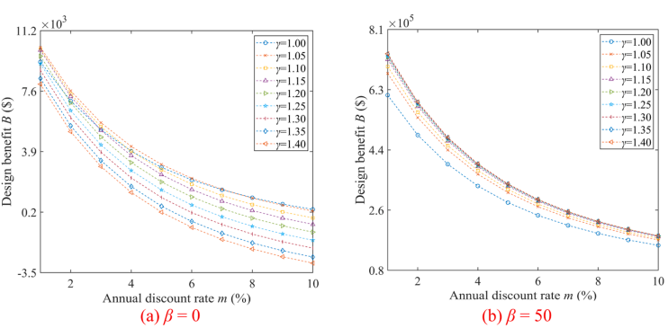 图9 折现率m对设计收益的影响(P(T)=8×10^-6)