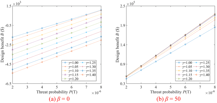 图10 威胁事件概率P(T)对设计收益的影响(m=8%)
