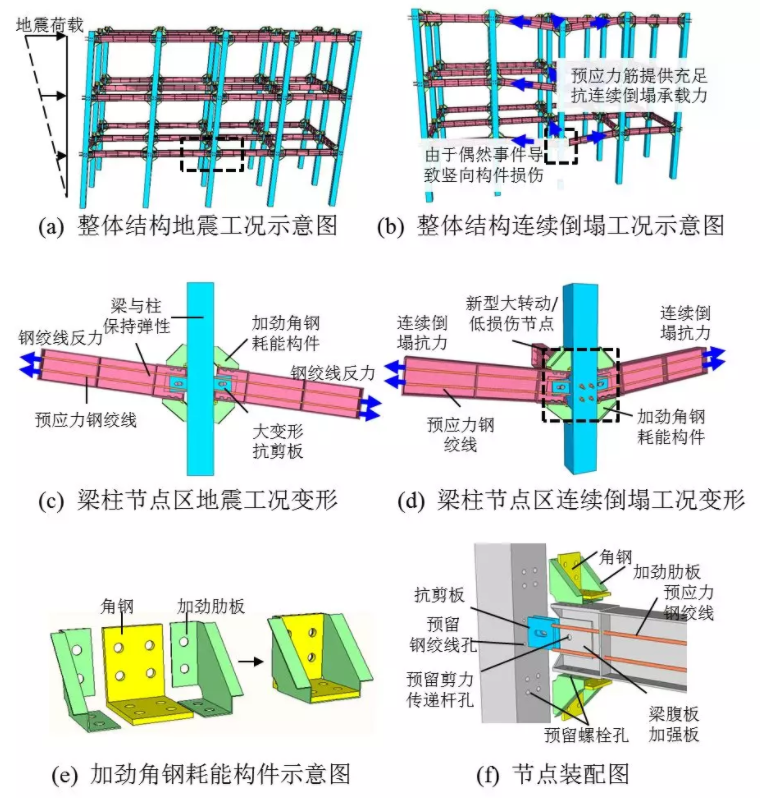 一年前,我们课题组又提出了一种地震-连续倒塌综合防御组合框架结构体系SPCRCF (新论文:地震-连续倒塌综合防御组合框架结构体系研究),如下图所示。