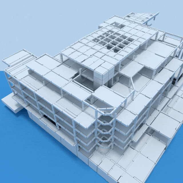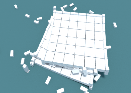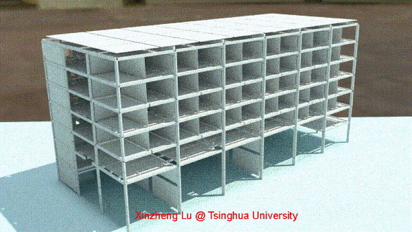 大变形倒塌分析完成后,使用Blender的渲染功能分别对结构小变形和大变形结果进行渲染,最终将渲染好的视频拼接得到结构倒塌的全过程。