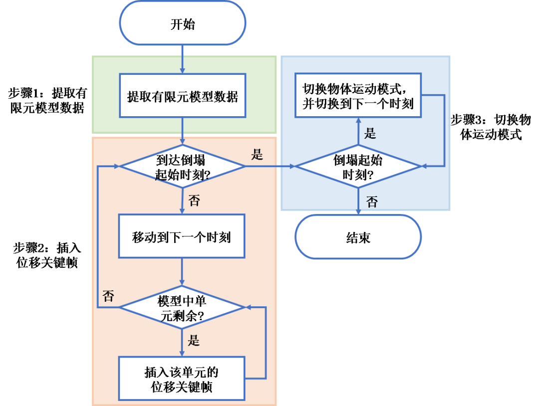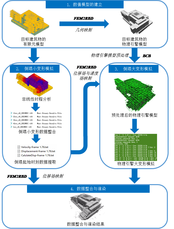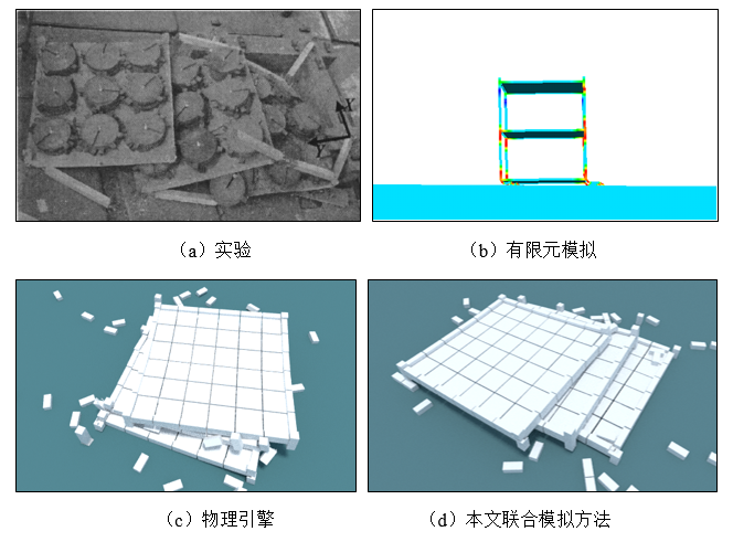 (1)本文提出的框架,在小变形阶段采用限元模拟,在大变形阶段采用物理引擎模拟,充分利用了两者的优势,可以避免有限元在大变形模拟中难收敛,无法形成废墟,以及物理引擎小变形阶段模拟准确度不高的问题。