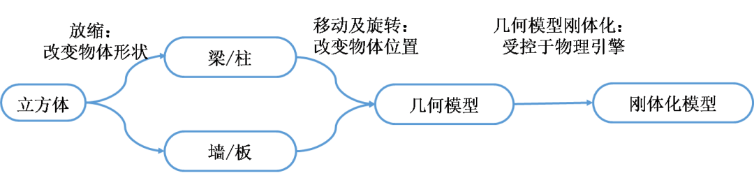 采用Blender中提供的基本网格——立方体(cube)作为基础网格进行物理引擎模型构建,几何模型映射分两步:1)形状变换与位置变换:利用Blender提供的基本网格进行形状变换与位置变换,得到与有限元模型单元相同形状和位置的几何单元。2)单元刚体化:将几何模型转换为受物理引擎控制的刚体模型。具体实现详见论文。