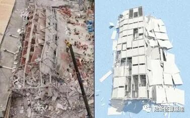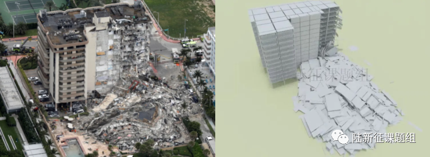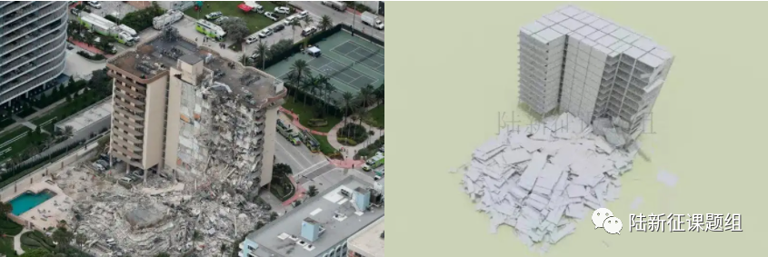 2. 2021年,美国佛罗里达州高层公寓倒塌事故倒塌过程和废墟分布模拟。