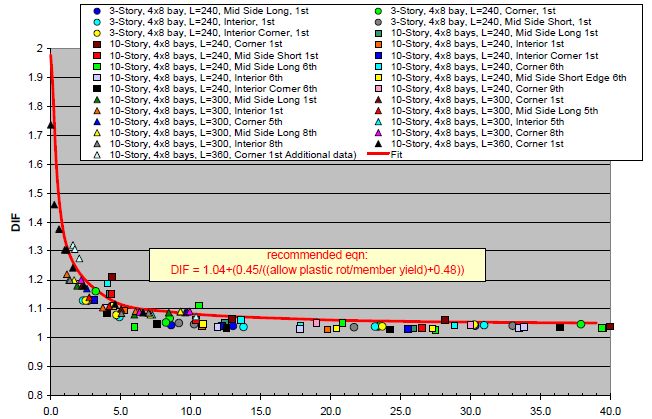 美国国防部和总务局的两部抗连续倒塌设计规范目前被科学研究和工程实践广泛接受,两部规范关于动力放大系数的最新规定相同,其计算公式是对2个3层和10层框架结构在不同拆除柱工况下所有计算结果进行拟合得到的(图2),其中计算采用sap2000工程软件。针对非线性静力设计和线性静力设计,规范给出了2个不同的动力放大系数计算公式,这样工程上采用简单的线性或非线性的静力计算获得抗力需求后,直接乘以该系数就可以近似获得实际结构的非线性动力抗力需求。在拟合得到计算公式中,动力放大系数是延性系数(for非线性静力计算)或延性相关指标(也就是m-factor,for线性静力计算)的函数,其中不同部位柱被拆除会使结构发生不同延性的变形,相应的动力放大系数是在等位移/变形准则下,非线性动力承载力和(非)线性静力承载力的比值。