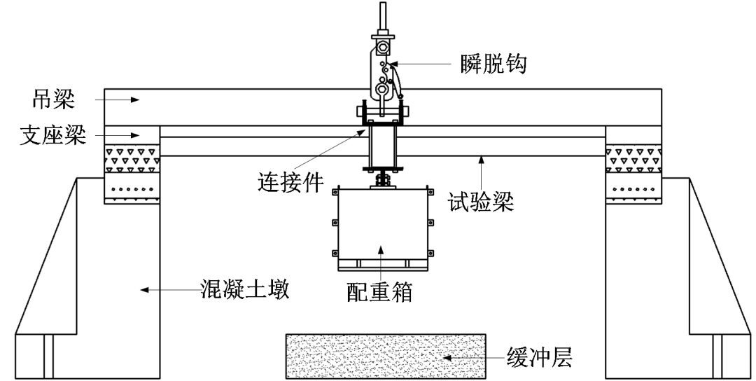 动力试验成功进行了4次,在试件上施加了4个不同等级的配重(分别为:14.11kN(DT-1), 19.21kN(DT-2), 21.17kN(DT-3), 28.03kN(DT-4)), 然后通过瞬脱钩突然释放配重,使得试件进入动力倒塌过程。通过结构变形和材料应变响应分析了试件的动力倒塌破坏机理,并基于能量平衡原理分析了动力效应对结构连续倒塌抗力的影响。动力试验方案如图4所示,试验中试件边界条件与静力试验相同。