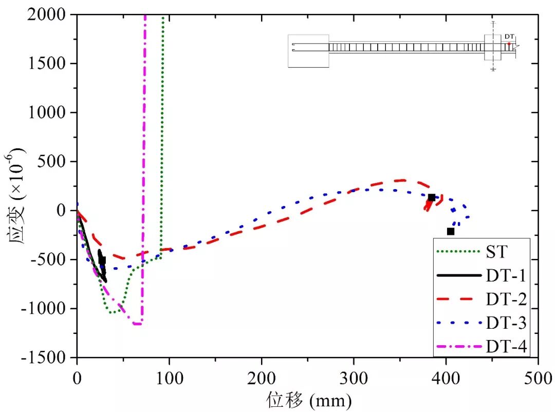 图8 DT-4试件跨中混凝土应变-位移曲线