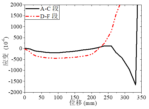 图8给出了DT-4试验的两侧梁跨中混凝土应变,可以看到加载初期随着变形加大,不均匀受力导致应变差不断增大。在构件层次上,将会导致积累的梁轴向出现变形差,当变形差足够大时,构件约束使得两侧梁的变形重新调整、应变重新同步发展,这导致材料应变出现一个波动。