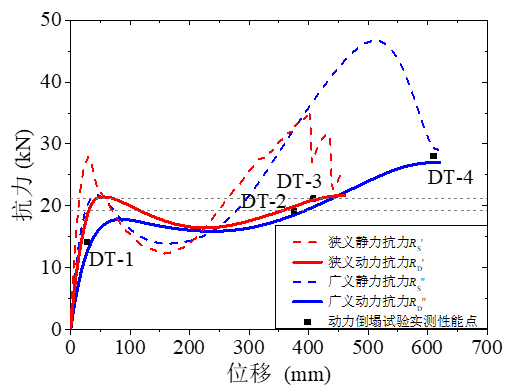 4次动力试验的性能点如图9(a)中4个方形点所示。从曲线对比,可以发现: 广义动力抗力曲线能够更好地描述结构的实际性能,4个性能点均穿过了该曲线。特别是DT-2和DT-3,如按照狭义动力抗力曲线进行分析,小变形下结构具有两个抗力相同的性能点,试件应该在该变形下达到新的平衡状态。但根据广义动力抗力曲线,小变形下结构抗力低,因此试件不可能在该变形下平衡,只能在实测位移376mm或408mm时达到平衡。这进一步证明了上述试验和理论分析的正确性。