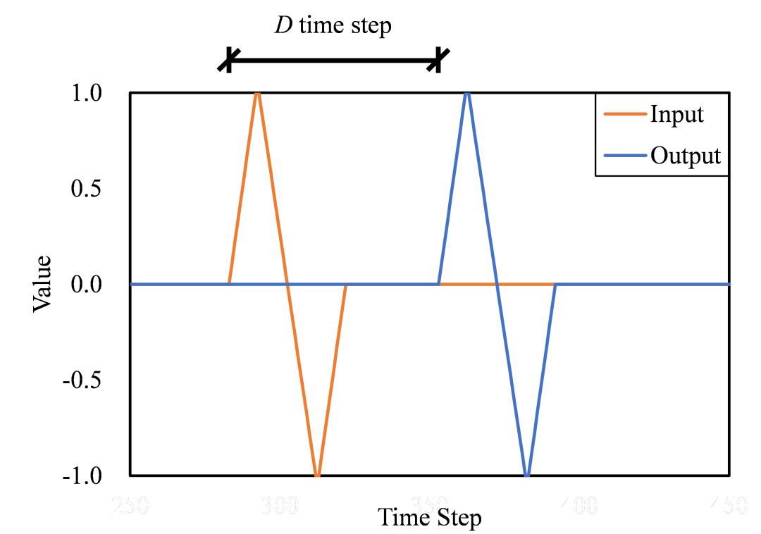 为验证上述分析,本研究设计了一个“记忆试验”。该试验中,输入为长2000步的时间序列,而输出则为输入序列的拷贝,但向后推移了D个时间步,如图3所示。本研究中,建立了15个不同的数据集,分别取D为10、20、30、40、50、60、70、80、90、100、200、500、1000、1500和1900。每个数据集均包含1000条随机起点的样本(700训练,200验证,100测试)。