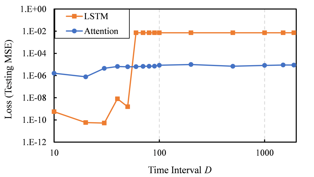 随后,本研究基于LSTM网络和以注意力机制为基础的Transformer网络,开展了网络训练与测试,得到如图4所示的结果。可以看出,Transformer网络在不同间隔D的情况下,表现变化幅度不大。但当D ≤ 50时,LSTM网络的性能优于Transformer数个数量级;而当D ≥ 60时,结论完全相反。需要指出,研究过程中多次调整了网络的超参数(如隐藏层维度、层数、初始学习率等),但并不会改变上述结论。