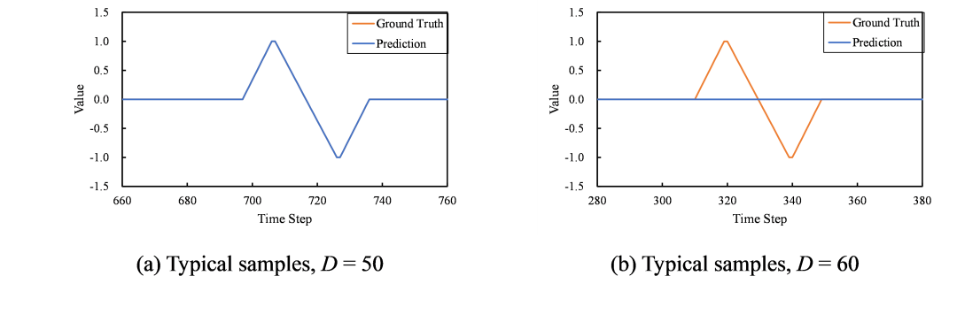 进一步的,选取D = 50和D = 60两种情况下的关键案例进行分析(如图5所示),可以看出,D = 50时LSTM网络近乎完美的复制了输入序列,而D = 60时则几乎遗忘了所有信息(预测结果几乎恒为0)。
