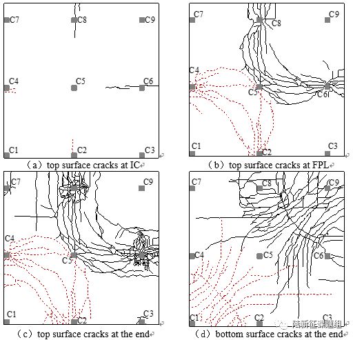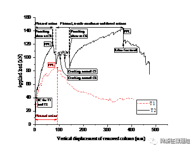 图8是两个试验的承载力位移曲线图,其中T1 是有箍筋加固的,T2是有500 mm板长外延的。T1的破坏形态非常明显,主要是弯曲破坏,这种局部在角柱周围的破坏模式和Ronan Point 倒塌案例(图1)相似。而T2除初期的弯曲破坏外,C6 和C8 分别发生冲切破坏,并且结构通过一种组合形态的机制继续承载,其中包括弯曲机制,拉膜机制和销栓机制。这一破坏后承载机制一直持续到第二个承载力峰值,伴随着一根在C6的底部穿柱钢筋断裂。通过对比这两个试验发现,在有500 mm 板长外延情况下拆除角柱,结构承载力提高了168%,从而降低了结构发生连续倒塌的风险。此外,板在不同阶段裂缝的发展情况如图9所示。图10和图11分别是T1和T2 最终破坏形态。