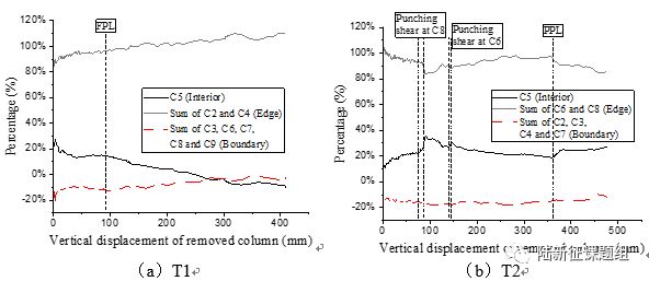 通过对柱子受力情况进行监测发现,在不同角柱位移的情况下,各个柱的受力情况以百分比的形式展现在图12中。因为提供边界约束的柱子(boundary columns) 是受拉的,为负值,所以离角柱最近的两个边柱所受压力大于对板的总施加荷载。大约80% 到 110%的荷载由边柱承担,此现象和移除中柱时一致。
