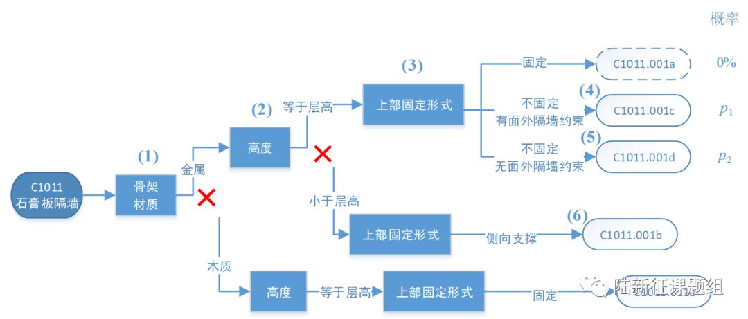 首先,通过根据FEMA P-58的分类规则建立决策树,进而确定候选易损性分类编码。一块石膏板隔墙在FEMA P-58对应的候选易损性函数编号如图2所示。