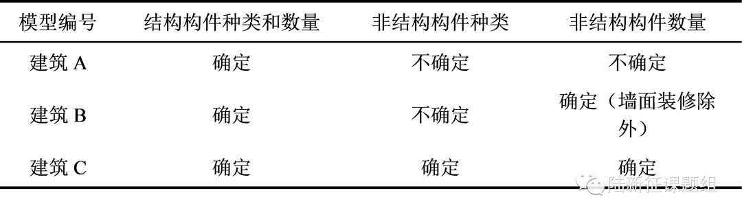 为了考察建筑数据完备程度给震损带来的不确定性,本文以这个基准模型为基础,建立了3个虚拟的建筑信息模型,如表1所示。注意:结构构件的数据完备程度会影响整个建筑的地震响应。为了控制不确定性的来源,假定3个虚拟建筑的结构构件种类和数量是确定的,且完全相同。