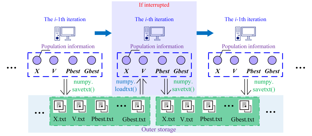 在粒子群算法中,粒子的关键信息—位置、速度以及适度值等,往往以向量的形式储存在程序中。根据这个特性,本研究通过Python中Numpy函数库的"savetxt()"以及"loadtxt()"函数将粒子群的信息以TXT文件的形式保存到程序外部。在优化计算中断后,可将粒子群的信息导回程序中恢复运行。