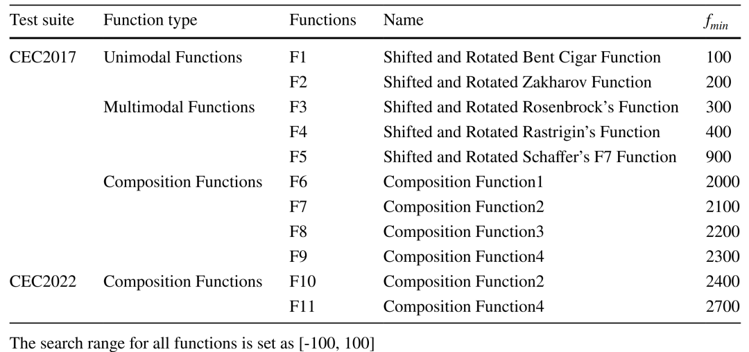 以CEC2017以及CEC2022测试函数集中的11个函数测试各个缩减策略在不同复杂度的优化问题上的表现。这些函数可分为三类:单峰函数、多峰函数以及复合函数。
