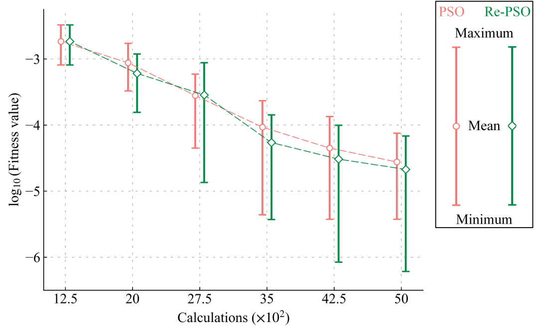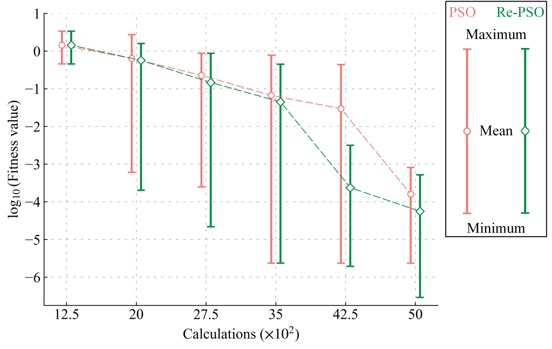 保持相同的算法超参数设置以及粒子评估次数,执行10次的独立运行。优化对比结果如图9所示,Re-PSO显著提升了收敛速度与结果精度。