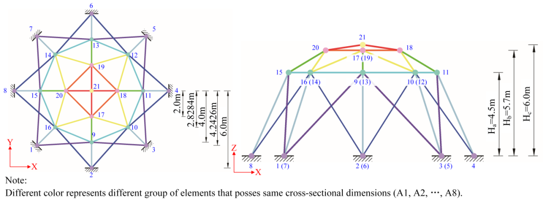 以一个空间网架结构为例,通过优化结构中杆件的截面积和结构布置形式,从而减少材料用量,目标函数如下式所示: