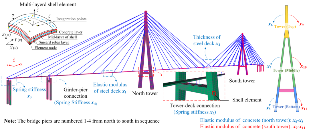 以苏通长江大桥的振动台试验数据的模态识别结果为更新目标,构造下式的目标函数。选取包括材料弹模、几何尺寸等11个参数,开展上述桥梁的线性更新。
