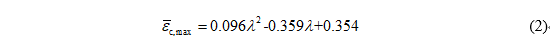 钢筋使用多段线弹塑性材料模型(*MAT_PIECEWISE_LINEAR_PLASTICITY),混凝土使用光滑封闭屈服面模型(*MAT_CSCM)。由于最终的冲切破坏是由于受压区的混凝土压碎导致,所以该混凝土材料模型中内置的最大主应变失效准则并不适用,而是使用更具综合性且包含剪切变形的最大有效应变(epsilon_smax)失效准则(*MAT_ADD_EROSION)来实现冲切破坏。考虑到最终的冲切破坏取决于板柱节点的受弯变形能力,模型中采用一个综合的“柔度指数”lambda(式(1))来描述该变形能力,并将其与失效准则相关联。构建“柔度指数”时考虑的主要因素有:混凝土强度f'c、板内配筋率rho、支座形式、板厚d及跨度L。