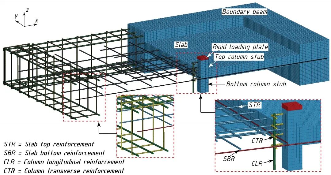 对于钢筋,最大有效塑性应变失效准则可以实现在试验后期大位移阶段的钢筋拉断。最终建立好的板柱节点模型见图 3。