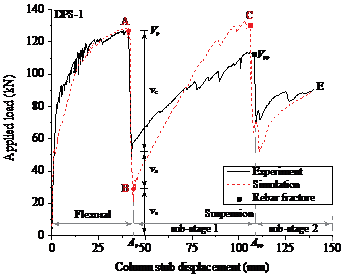 试验中与模拟的最终破坏模式对比见图 4。可以看到试验中板的裂缝、柱头冲出板面及钢筋网产生的悬挂作用等试验现象均可以较好地模拟出来。图5展示了试验与模拟的荷载位移曲线对比,也表明通过模拟可较为准确地得到板柱节点在弯曲阶段、冲切破坏及冲切后阶段的结构行为。进行数据分析对比后可知冲切承载力Vp主要由受压区混凝土的抗剪承载力vc,冲切破坏面上的摩擦力及骨料咬合力va,和穿柱钢筋的销栓作用vs组成(见图 5)。