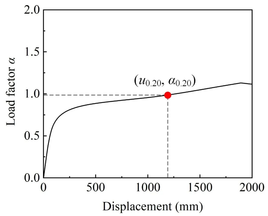 基于Step5中的α-ud曲线,计算梁端转角达到0.20rad前的最大荷载系数α,记作α0.20(如图4所示);对于某个给定的α,当α≤α0.20时,结构在该拆除柱工况下不会发生连续倒塌,否则结构将发生连续倒塌。随后统计抽样模型中发生破坏的比例作为该α对应的失效概率Pf。