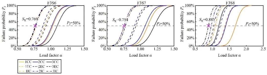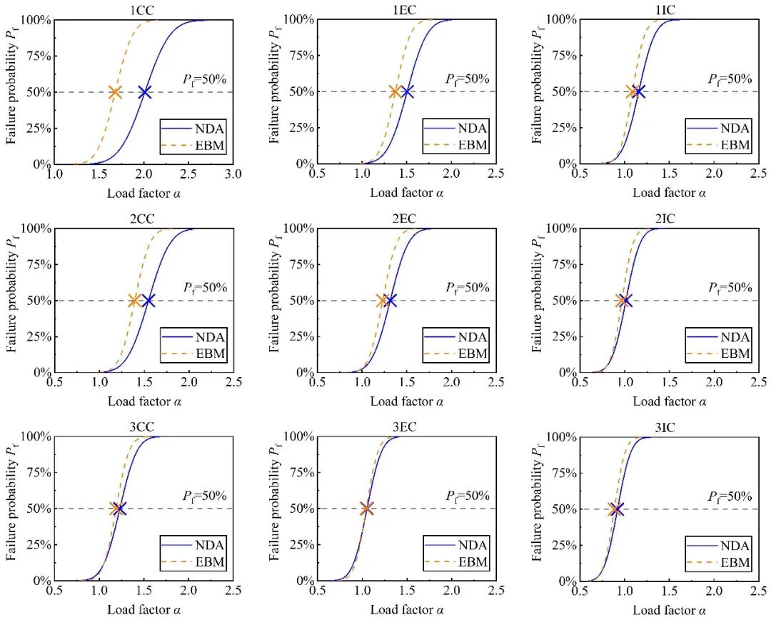 对于计算消耗,当框架样本数量为100时,若基于NDA开展易损性分析,为得到3层RC框架所有工况的连续倒塌易损性曲线,需要进行约10000次非线性动力分析(100×9个工况×(10至15个荷载系数α))。但是,基于本研究提出的分析流程,仅需要900次的静力Push-down分析(100×9个工况)即可获得所有构件对应的易损性曲线。因此,本研究提出的简化方法能够在保证结果精确度的前提下大幅度降低计算消耗。