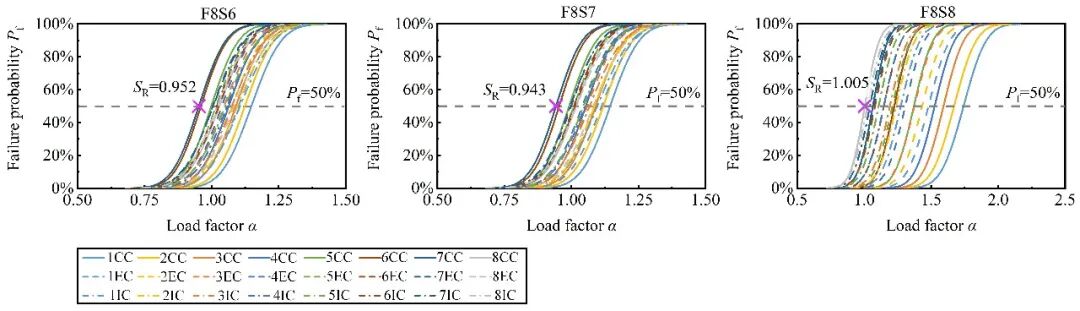 基于上述流程,进一步研究了我国典型RC框架结构的连续倒塌易损性。共设计了9个RC框架,楼层数量分别为3、6、8层;每种楼层数量的结构各3个,分别对应6度、7度、8度抗震设防烈度。易损性分析得到不同结构的结果如图7,根据易损性曲线计算各框架不同构件的鲁棒性指标如图8所示,图中,FiSj表示i层框架,设防烈度j度。