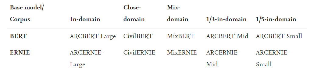 在此基础上,使用masked language model模型与上述五种领域语料库进行进一步预训练,训练了10个预训练模型,如表2所示。