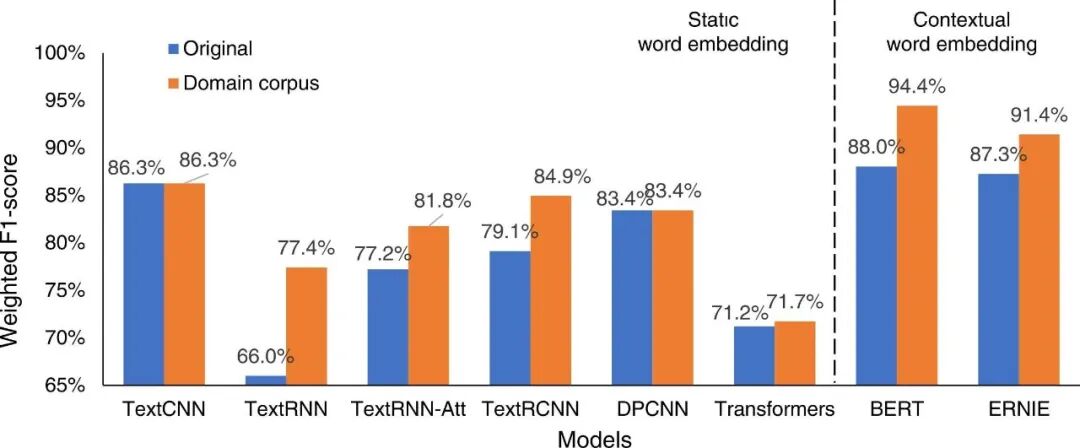 (1)对于TC和NER任务,领域语料库可以优化基于静态词向量的深度学习模型和基于动态词向量模型的深度学习模型。对于TC任务,两类模型加权 F1 分数分别提高了 11.4% 和 6.4%,对于NER任务,两类模型宏平均 F1 分别提高了 8.7% 和 5.4%。