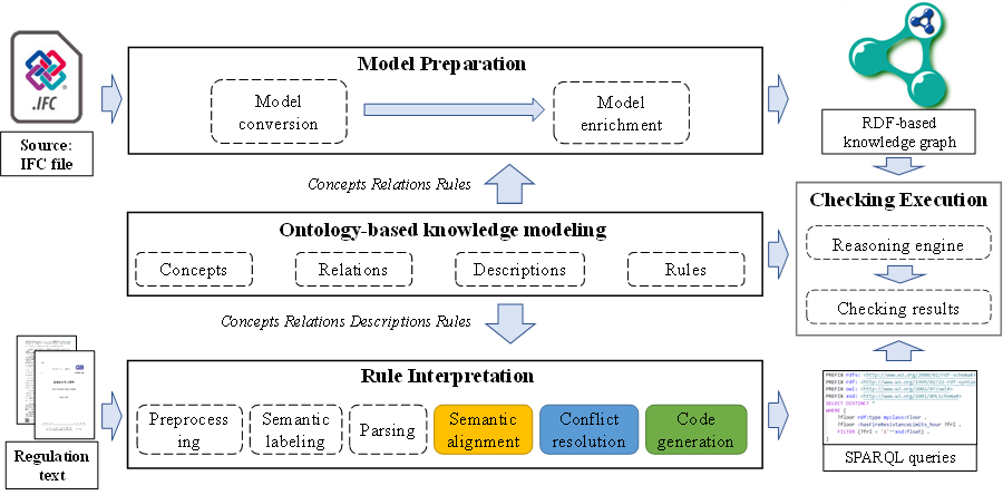 本文中采用课题组此前[1]所提出语义标注与解析方法,从自然语言规范生成语法树;采用维基百科中文语料和中文规范语料库训练词向量模型,从而计算文本表达的概念与本体概念的语义相似度,实现初步语义对齐。随后提出两类冲突消解方法,即域-值冲突消解方法和等价类冲突解决方法,根据土木工程领域知识修改语义对齐结果。在语义对齐和冲突解决之后是代码生成环节,本文采用一种基于领域关键词与规则的条文分类方法,以识别出适合不同条文的SPARQL函数;最后执行代码生成步骤以将语法树转换为计算机可处理的格式(本文以SPARQL为例)。