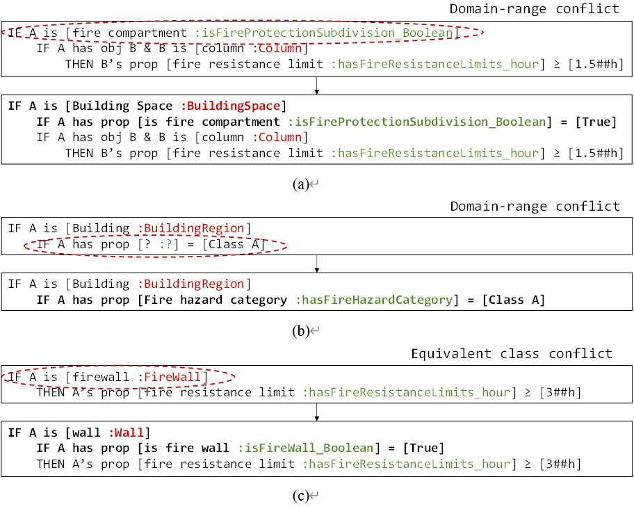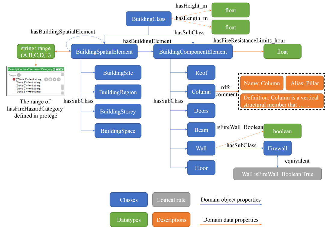 首先,为了整合特定领域的知识和概念,利用半自动本体构建方法开发了建筑防火本体(FPBO)。此外,还基于FPBO和领域知识,人工定义了所有类(class)、数据属性(data property)和对象属性(object property)的域值(domain-range)约束、等价类(equivalent class),以用于冲突消解。定义了用于模型语义扩充的SWRL规则,以基于推理机获取建筑物中的隐含信息。