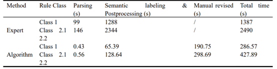 (3)将所提出的方法所消耗的时间与专家人工解译所消耗的时间进行比较,即使考虑人工修正时间,自动规则解译所消耗的时间仅是人工解译时间的五分之一,所提出的规则解译方法大幅提升了审查效率。