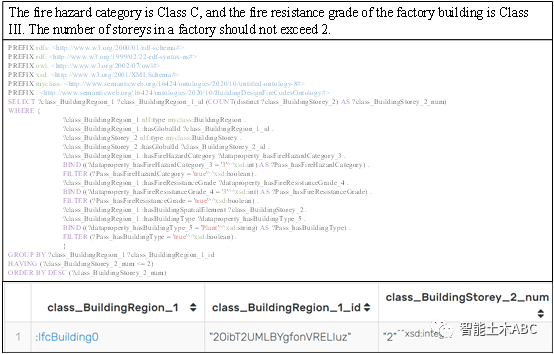 本文中对一个实际工厂建筑实施规则检查,选择三个示例规则,包括一个直接属性简单条文和两个间接属性复杂条文。利用所提出的方法,将规则解译为SPARQL代码,并使用GraphDB执行代码,以检查模型合规性。图6显示了“生产的火灾危险性类别为丙级,厂房的耐火等级为三级的厂房层数不超过2层。”这条规则解译及模型检查结果。所提出的系统正确进行了规则解译并发现了模型中不符合规范之处。检查结果提供不合规元素的全局 ID,用户可以根据全局 ID 直接定位到不合规的构件。