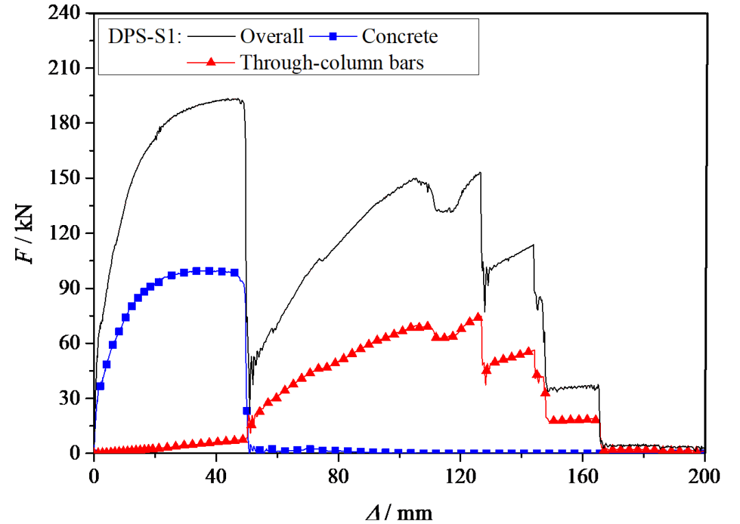 👉暗梁使得穿柱纵筋受力和变形协调,导致不同冲剪方向下的悬挂机制受力无明显区别(UPS-S1和DPS-S1)。暗梁能够同时提高试件受弯机制和悬挂机制的承载力峰值,且可提高悬挂机制下的变形能力;