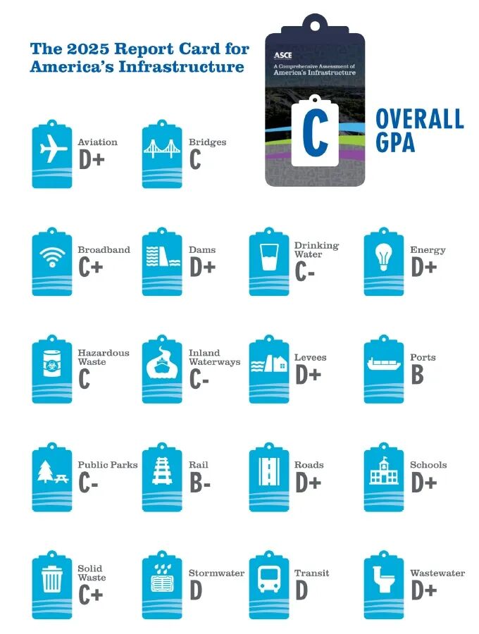 2025年《美国基础设施报告卡》为我们基础设施系统的现状提供了概览,并提出了改善每个类别性能的解决方案。在第二份报告中,报告卡的评分表明,得益于全面支持、创新解决方案和果敢的领导力,美国基础设施正朝着正确的方向发展。持续的行动将进一步改善这些网络,释放我们国家经济的全部潜力,并为所有美国人创造机会。