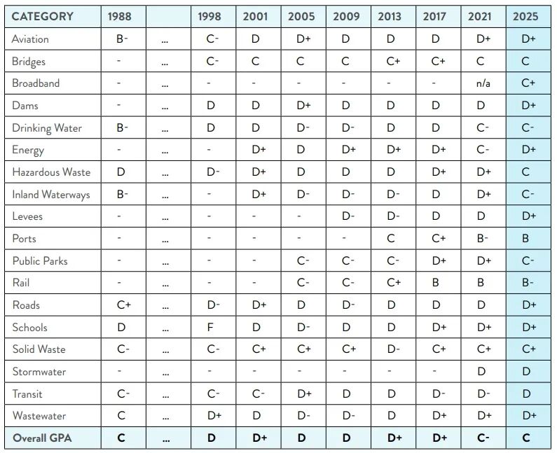 2025年的评分范围从港口的B到雨水和公共交通的D。自1998年以来,首次没有类别被评为D−。在评估的18个类别中,有8个类别的评分有所提高,其中许多类别多年来一直停滞在D-或D。这一改善得益于政府和私营部门优先投资于历史上被忽视的系统。能源和铁路两个类别因容量、未来需求和安全问题被降级。2025年新增了宽带作为评分类别,得分为C+。尽管有证据表明整个基础设施系统有所改善,但仍有9个类别处于D级范围,这清楚地表明需要采取更多措施来改善美国建筑环境的健康状况。