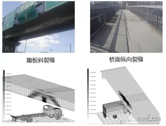 我们首先在实验室进行了超高车辆撞击桥梁上部结构的模型试验,制作了油罐车罐体模型,通过摆锤运动撞击混凝土T梁、钢箱梁、钢板梁、FRP梁桥模型,获得了撞击作用下不同桥梁的破坏机理(图6)。