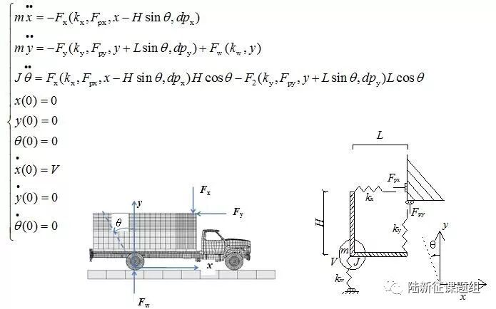 并发现,整体破坏模式主要和撞击过程的冲量大小有关,局部破坏模式主要和撞击过程中的最大撞击力有关。于是,就要设法提出撞击过程中总冲量和最大撞击力的计算方法。为此,我们首先建立了超高车撞击桥梁上部结构的理论模型。根据超高车撞击桥梁过程中的运动学特征(图10),通过大量参数讨论论证可以进行如下简化(1)忽略车厢-桥梁摩擦力;(2)忽略车轮-路面摩擦力;(3)忽略车辆重力;(4)桥梁简化成刚性墙。得到相应的简化模型和运动微分方程(图11)。