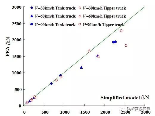 求解该运动方程,就可以很好的模拟超高车辆撞击过程(图12),且无需使用复杂的非线性有限元分析,为提出工程设计方法奠定了基础。