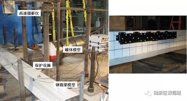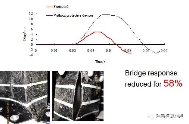 针对既有桥梁防护车辆撞击的需要,我们还发明了一种高效轻质的耗能防护装置并获得了发明专利(图18),并通过撞击模型试验验证了该装置的有效性(图19)。