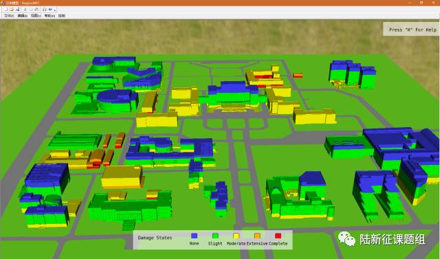 3. 图2给出了结果的可视化场景,单击某栋建筑,可以弹出该建筑的破坏状态等信息,如图3所示,按“D”键,可以查看整个区域的建筑破坏情况,如图4所示。图5给出了建筑地震响应动画。详细的操作说明可以参阅本文后面的教学视频,也可以在软件包中找到。