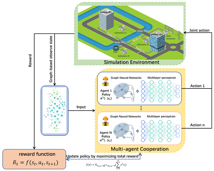 首先开发了一个模拟环境,包括灾害强度评估、部件损坏评估、系统恢复模拟和韧性量化。该框架利用图论来表示不同系统之间的相互依赖关系,并将异质图神经网络集成到该框架中来提取整个社区的拓扑结构和相互依赖信息。考虑到修复过程的不确定性,采用多智能体深度强化学习算法训练神经网络逼近最优的修复策略。以清华大学校园为例,在考虑不同决策目标的情况下,验证了该方法的优越性和有效性。最后使用迁移学习降低计算开销,以实现快速决策。