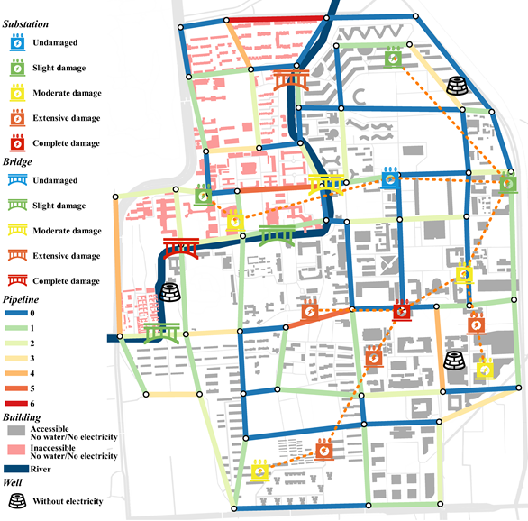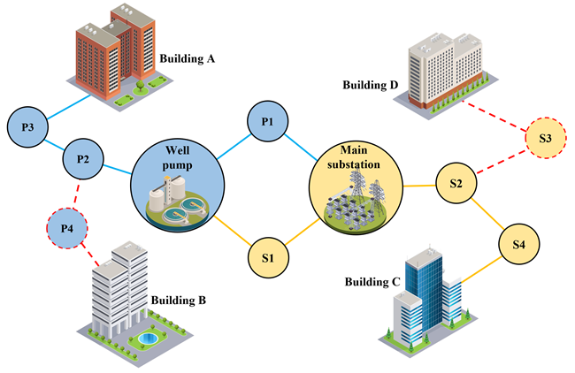在社区中,关键基础设施系统(如供水系统、供电系统和交通系统)协同运行,为建筑群落的居民提供生活保障。一个基础设施系统的正常运行可能依赖于其他基础设施系统的组件,因此如果地震发生,这些相互依赖关系可能引起级联失效,增加了组合系统的整体脆弱性。