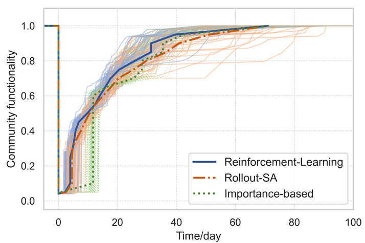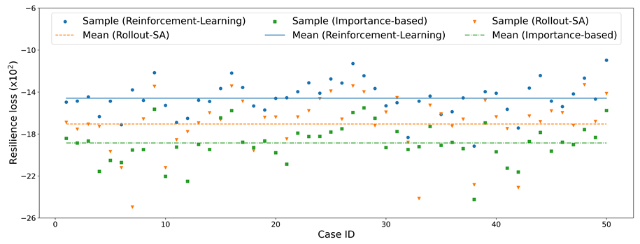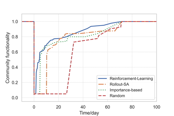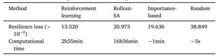 最后我们基于迁移学习进一缩短计算时间,利用先验的学习权重进行训练可在10分种内完成训练,有助于实现灾后的快速辅助决策。我们计算了50个不同随机采样下的恢复曲线和韧性指标,结果表明整合迁移学习的决策框架相比其他算法实现了最优的决策表现,并兼顾了计算效率。
